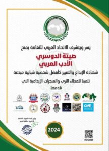 شهادة أفضل شخصية شبابية مبدعة في العالم العربي في مجال الأدب العربي عام 2024م من الاتحاد العربي للثقافة
